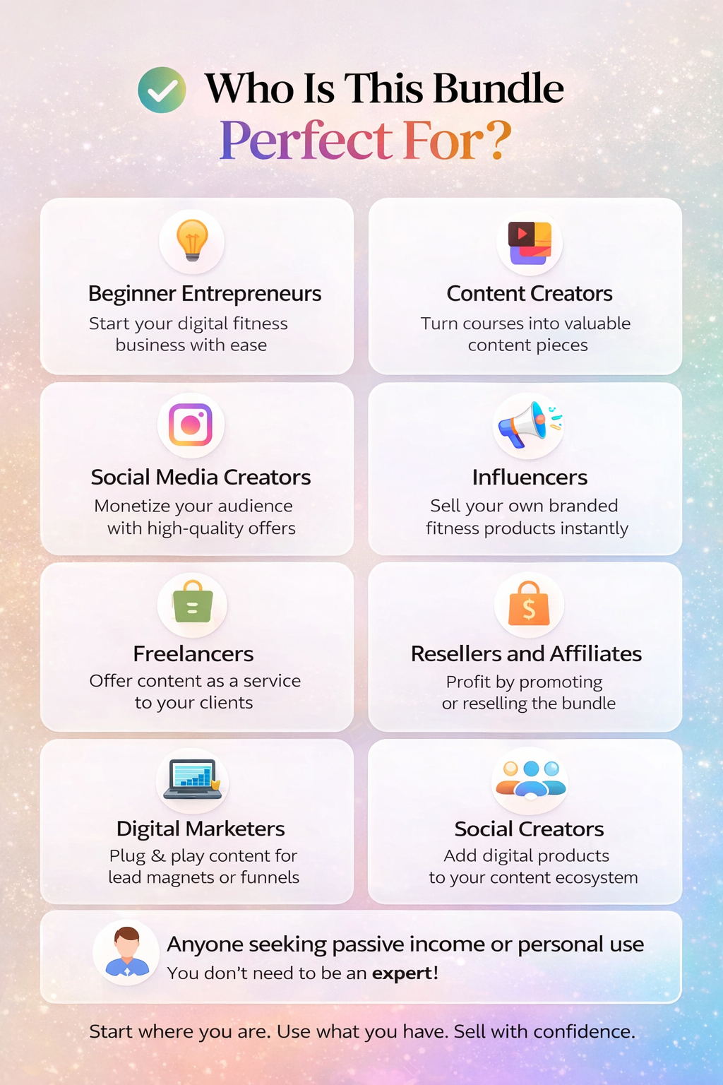 Whether you are a personal trainer, fitness coach, wellness entrepreneur, digital product seller, or content creator, this bundle gives you everything you need to enter the fitness market with confidence and authority.